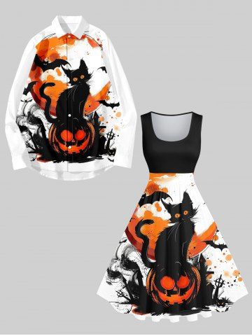 Plus Size Cat Pumpkin Bat Cross Ink Painting Splatter Print Halloween Costume Vintage Swing A Line Dress - Black - M