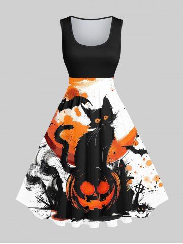 Halloween Dresses > Plus Size Cat Pumpkin Bat Cross Ink Painting Splatter Print Halloween Costume Vintage Swing A Line Dress