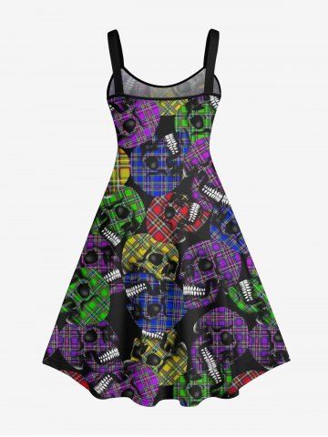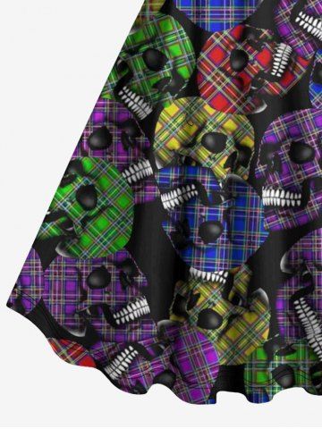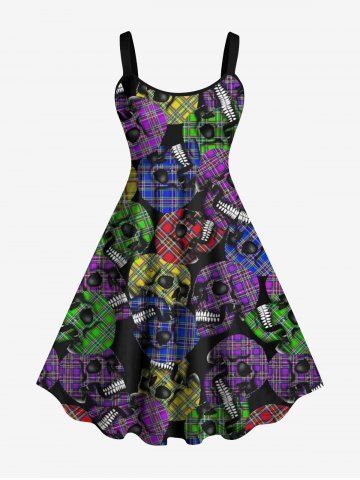 Halloween Dresses > Plus Size Colorful Plaid Skulls Print Halloween Costume A Line Tank Dress