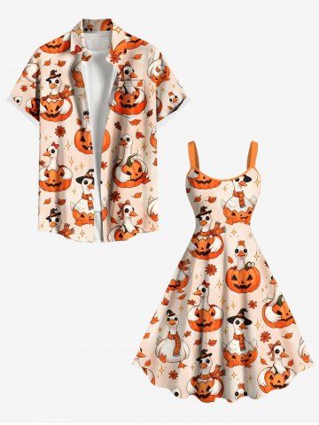 Plus Size Cute Pumpkin Goose Flower Stars Print Halloween A Line Tank Dress - Light Orange - S
