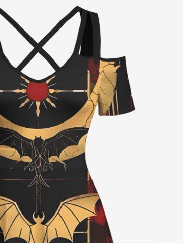 Halloween Dresses > Plus Size Distressed Bat Spider Colorblock Sun Print Halloween Costume Crisscross A Line Maxi Dress