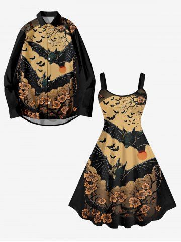 Plus Size Distressed Bat Tree Flower Sun Print Halloween Costume A Line Tank Dress - Black - L