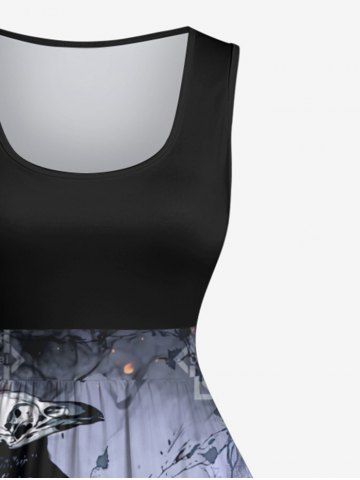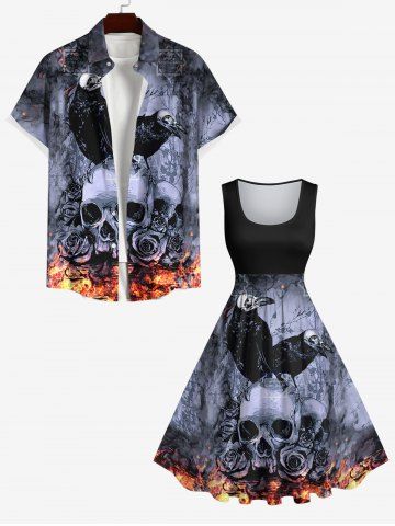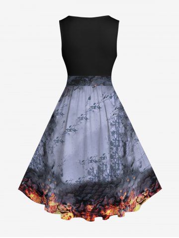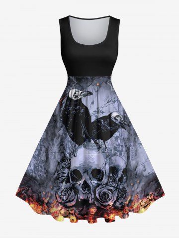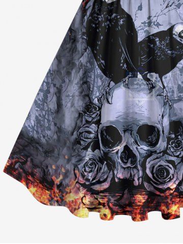Plus Size Distressed Crow Skull Rose Flower Fire Flame Print Halloween Costume Vintage Swing A Line Dress - Black - M