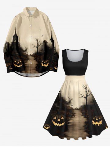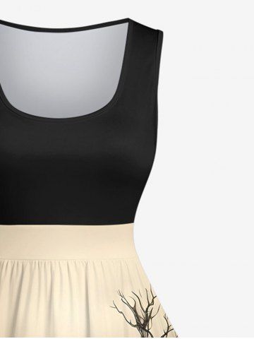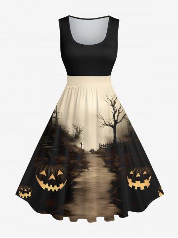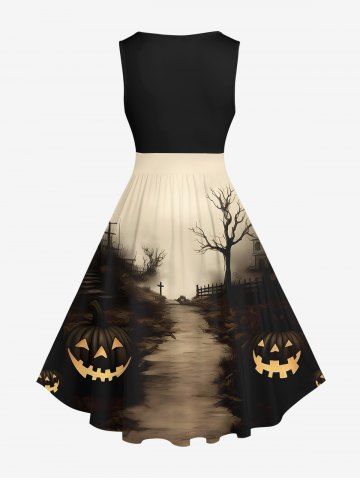 Halloween Dresses > Plus Size Distressed Pumpkin Castle Tree Road Print Halloween Costume Vintage Swing A Line Dress