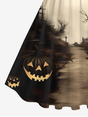 Plus Size Distressed Pumpkin Castle Tree Road Print Halloween Costume Vintage Swing A Line Dress - Black - L