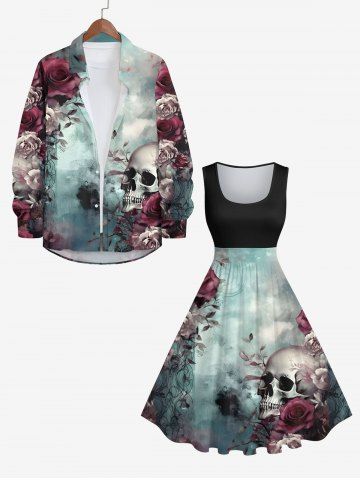 Halloween Dresses > Plus Size Distressed Rose Flower Skull Tie Dye Ombre Print Halloween Costume Vintage Swing A Line Dress