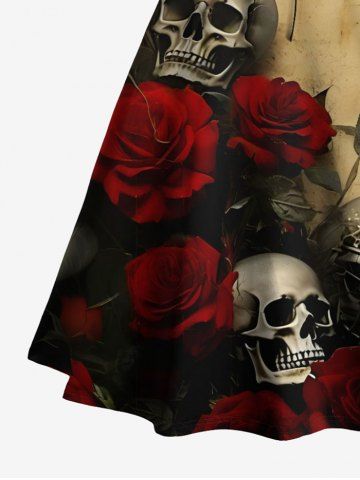 Halloween Dresses > Plus Size Distressed Skull Rose Flower Print Halloween Lace Up A Line Tank Dress