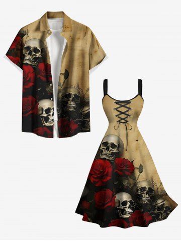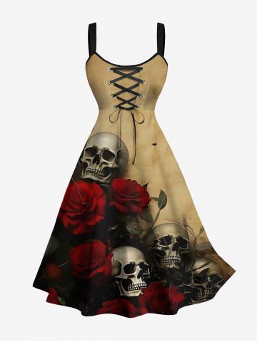 Halloween Dresses > Plus Size Distressed Skull Rose Flower Print Halloween Lace Up A Line Tank Dress