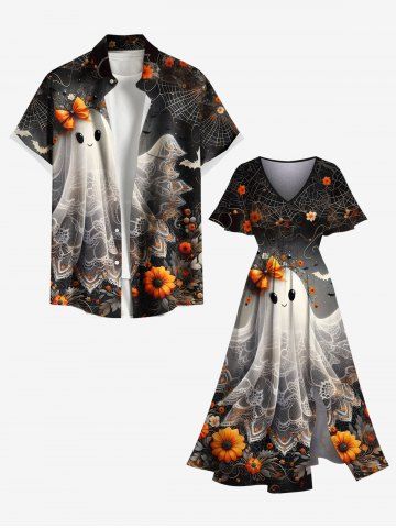 Plus Size Flower Spider Web Ghost Bride Print Halloween Ombre Split Pocket A Line Midi Dress - Black - S