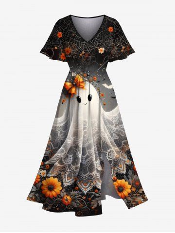 Halloween Dresses > Plus Size Flower Spider Web Ghost Bride Print Halloween Ombre Split Pocket A Line Midi Dress