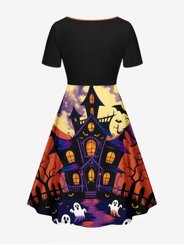 Plus Size Ghost Castle Tree Bat Moon Print Halloween Cinched A Line Dress - Black - 5x