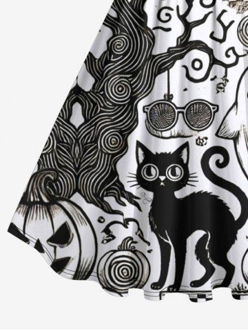 Plus Size Ghost Pumpkin Cat Tree Bat Skull Plaid Glasses Spider Web Print Halloween Costume Vintage Swing A Line Dress - Black - 5x