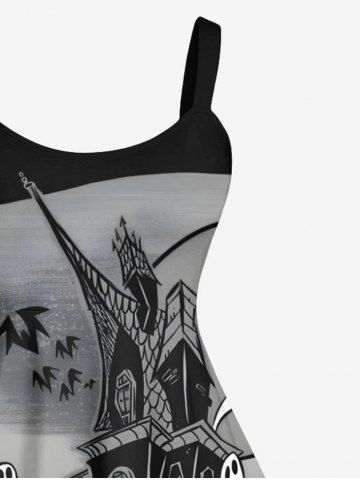 Plus Size Ghost Tombstone Castle Bat Print Halloween Costume A Line Tank Dress - Black - 1x