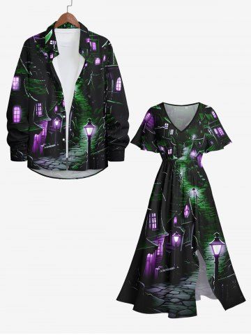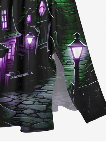 Plus Size Glitter Lantern Castle House Road Print Halloween Costume Split Pocket A Line Midi Dress - Black - 3x