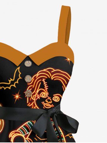 Plus Size Glitter Neon Pumpkin Bat Doll Star Galaxy Print Halloween Button A Line Dress with Removable Belt - Black - L