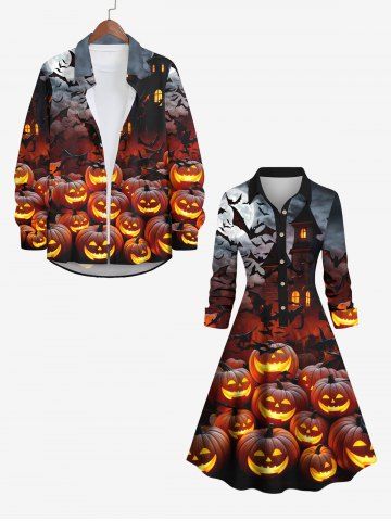 Halloween Dresses > Plus Size Glitter Pumpkin Lantern Bat Castle Ombre Galaxy Moon Print Halloween Costume Button Shirt Dress