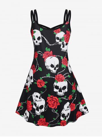 Plus Size Gothic Skulls Rose Printed A Line Sleeveless Dress - Black - L | Us 12