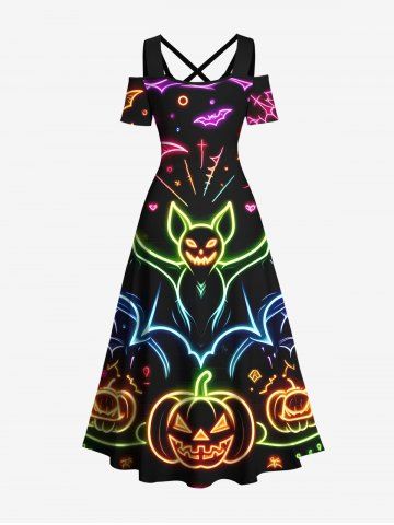 Halloween Dresses > Plus Size Halloween Bat Pumpkin Moon Heart Print Cold Shoulder Crisscross Maxi Dress