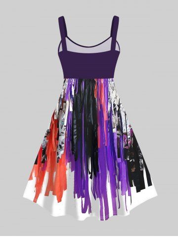 Plus Size Halloween Bat Wing Applique Ribbon Tassel 3D Print Tank Dress - Purple - S