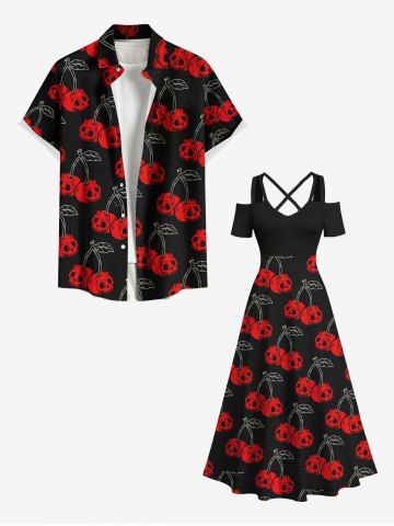 Halloween Dresses > Plus Size Halloween Cherry Skulls Print Cold Shoulder Crisscross Maxi Dress