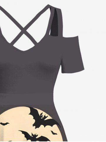 Plus Size Halloween Costume Bat Moon Tree Wazird Print Cold Shoulder Crisscross Maxi Dress - Gray - 6x