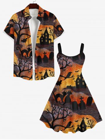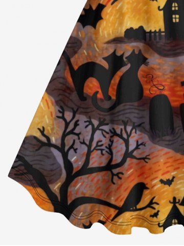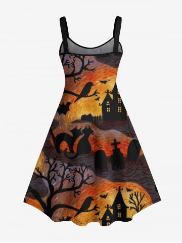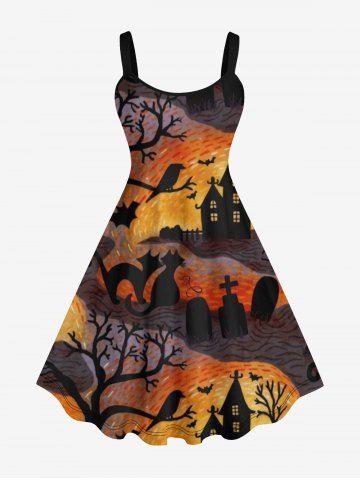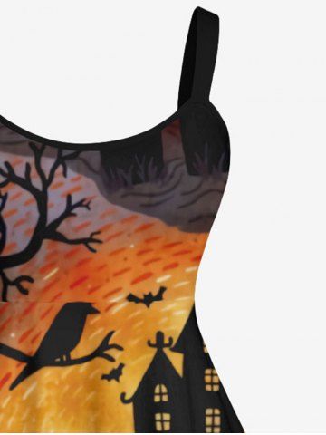 Plus Size Halloween Costume Cat Bat Bird Castle Cross Tomb Tree Print Tank Dress - Multi-a - L
