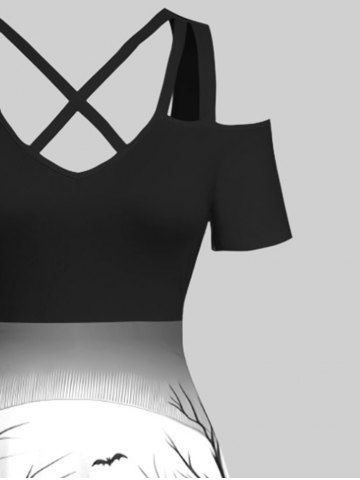 Plus Size Halloween Costume Cat Pumpkin Bat Tree Colorblock Print Cold Shoulder Crisscross Maxi Dress - Multi-a - M