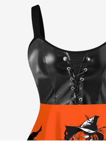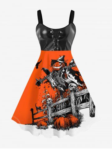Halloween Dresses > Plus Size Halloween Costume Colorblock Pumpkin Skull Eagle Lace Up 3D Print Tank Dress