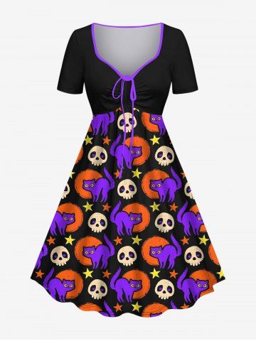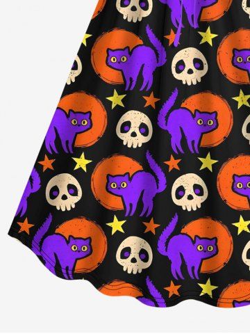 Plus Size Halloween Costume Cute Skull Cat Moon Star Print Cinched Dress - Multi-a - L