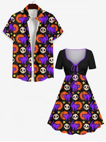 Plus Size Halloween Costume Cute Skull Cat Moon Star Print Cinched Dress - Multi-a - 1x