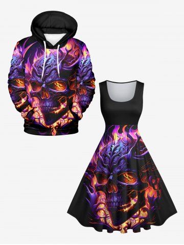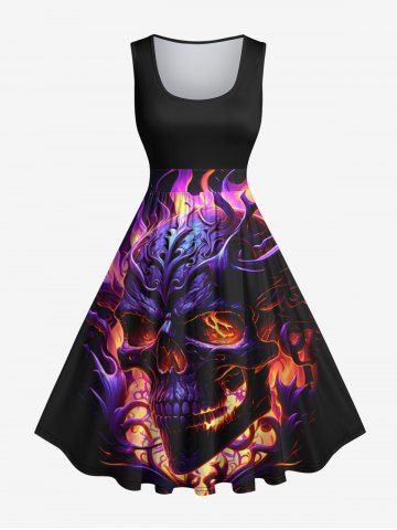Halloween Dresses > Plus Size Halloween Costume Fire Flame Metallic Skull Print 1950s Vintage Dress