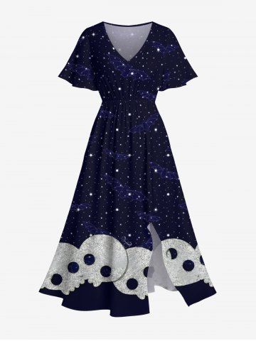 Plus Size Halloween Costume Galaxy Star Glitter Skulls 3D Print Split Midi Dress - Midnight Blue - M
