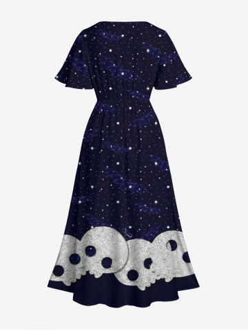 Plus Size Halloween Costume Galaxy Star Glitter Skulls 3D Print Split Midi Dress - Midnight Blue - 2x