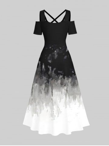 Plus Size Halloween Costume Ghost Oil Painting Colorblock Print Cold Shoulder Crisscross Maxi Dress - Black - 6x