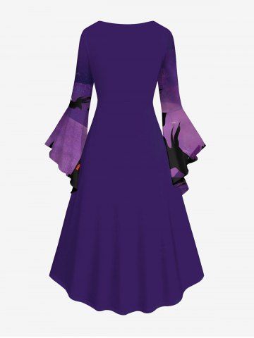 Plus Size Halloween Costume Ghost Pumpkin Moon Bat Print Flare Sleeve Dress - Purple - Xs