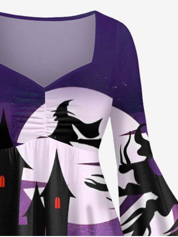 Plus Size Halloween Costume Ghost Pumpkin Moon Bat Print Flare Sleeve Dress - Purple - S