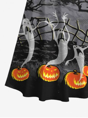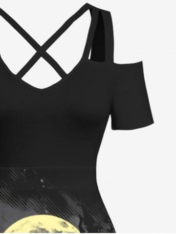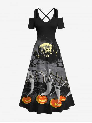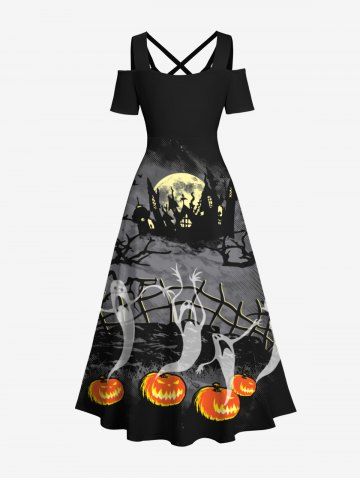 Plus Size Halloween Costume Ghost Pumpkin Moon Fence Tree Castle Print Cold Shoulder Crisscross Maxi Dress - Black - L