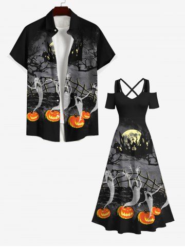 Halloween Dresses > Plus Size Halloween Costume Ghost Pumpkin Moon Fence Tree Castle Print Cold Shoulder Crisscross Maxi Dress