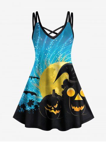 Plus Size Halloween Costume Hat Pumpkin Bat Moon Star Maple Leaf Print Crisscross Cami Dress - Multi-a - L