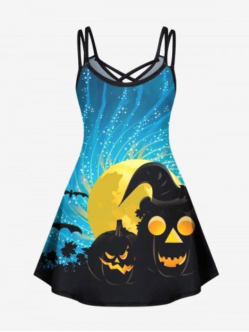 Plus Size Halloween Costume Hat Pumpkin Bat Moon Star Maple Leaf Print Crisscross Cami Dress - Multi-a - 1x