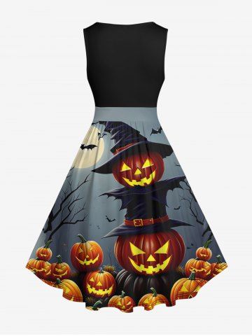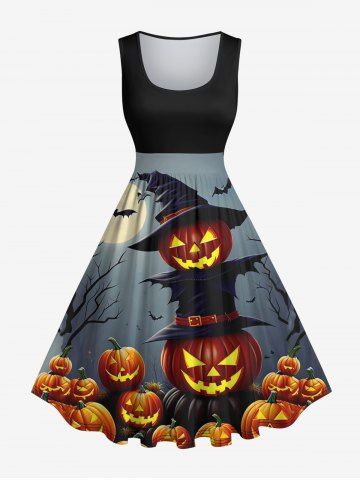 Halloween Dresses > Plus Size Halloween Costume Hat Pumpkin Bat Tree Moon Print 1950s Vintage Dress