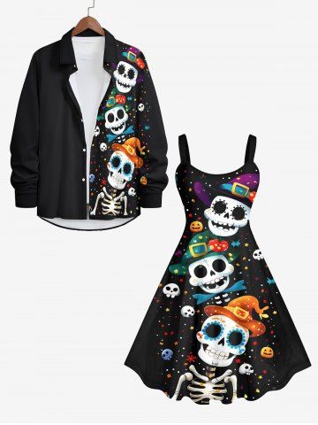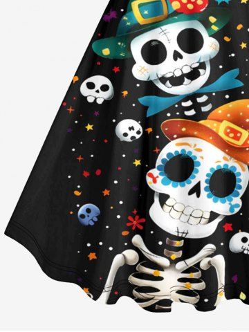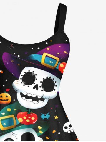 Plus Size Halloween Costume Hat Skulls Skeleton Flowers Pumpkin Print Tank Dress - Black - M
