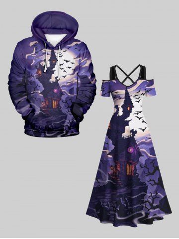 Halloween Dresses > Plus Size Halloween Costume Moon Bat Castle Tree Print Cold Shoulder Crisscross Maxi Dress