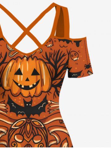 Plus Size Halloween Costume Pumpkin Bat Skulls Plant Print Cold Shoulder Crisscross Maxi Dress - Multi-a - 3x
