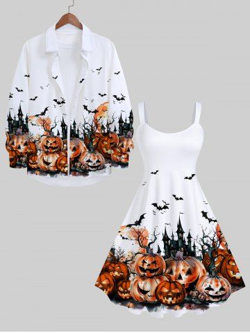 Plus Size Halloween Costume Pumpkin Bat Tree Castle Print Tank Dress - White - M
