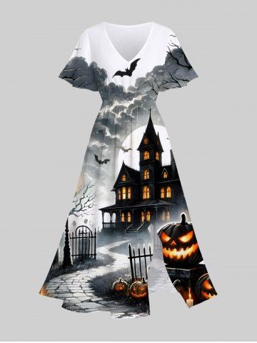 Halloween Dresses > Plus Size Halloween Costume Pumpkin Cross Bat Tree Casstle Cloud Moon Print Split Midi Dress