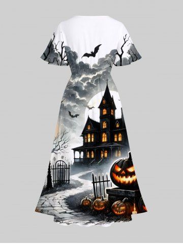 Halloween Dresses > Plus Size Halloween Costume Pumpkin Cross Bat Tree Casstle Cloud Moon Print Split Midi Dress