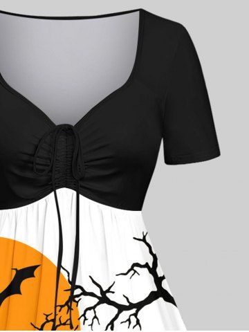 Plus Size Halloween Costume Pumpkin Cross Tomb Bat Tree Moon Print Cinched Dress - Multi-a - M