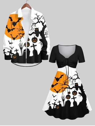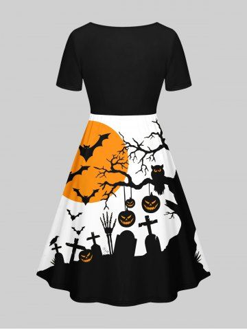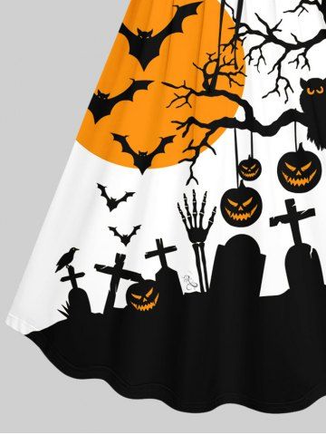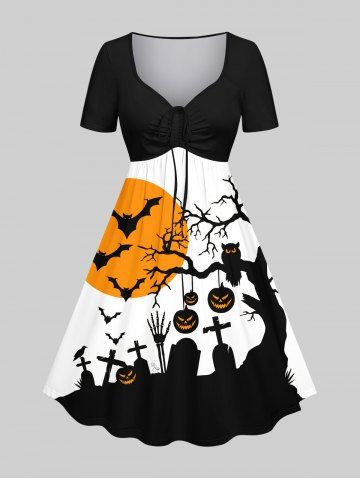 Plus Size Halloween Costume Pumpkin Cross Tomb Bat Tree Moon Print Cinched Dress - Multi-a - 1x