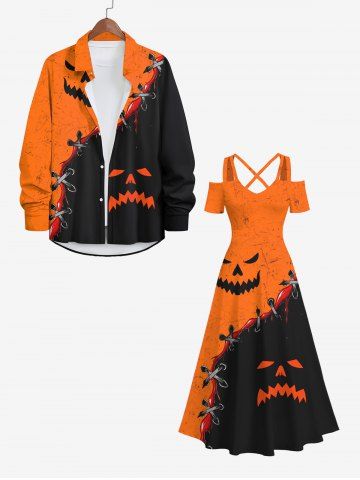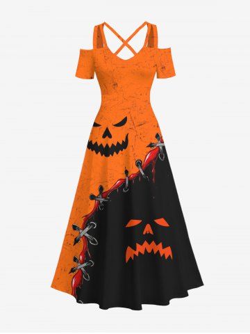 Halloween Dresses > Plus Size Halloween Costume Pumpkin Face Colorblock Ripped Lace Up 3D Print Cold Shoulder Crisscross Maxi Dress